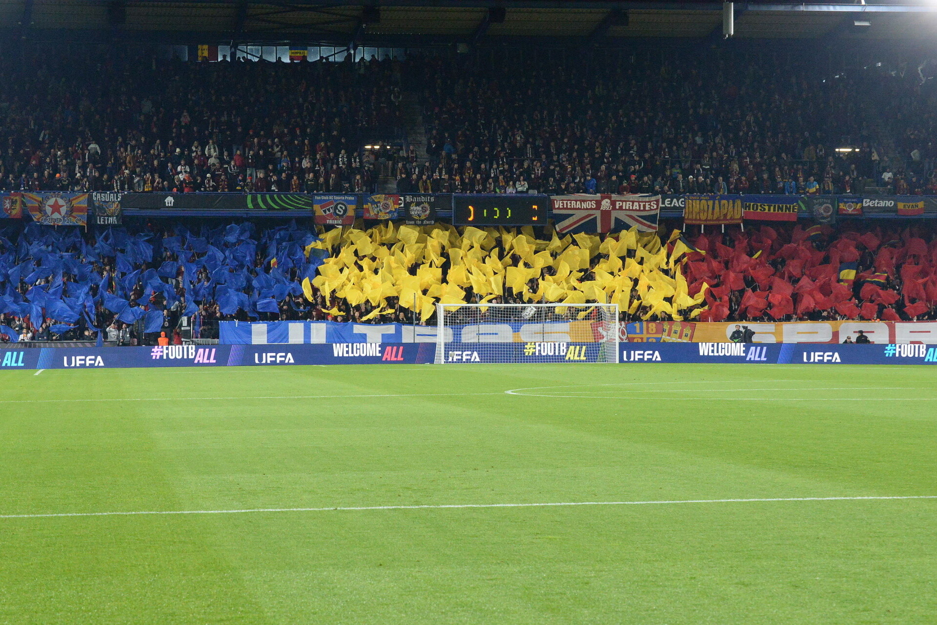 Výkop v neděli v 8 večer je hodně asociální, zvlášť pokud jde o výjezdy, nicméně Liberec není zas taková dálka a tak je ve sparťanském sektoru plno. Navíc na obou dlouhých tribunách je další hafo sparťanů, jak se ukáže nejen při děleném Sparta!-Praha!. Nejpozději od gólu je nálada v sektoru opravdu dobrá, sám sice stojím mimo kotel, ale docela dobře si zafandím. Baví mě, když se chorál rozjede s bubnem, pak se chvíli jenom tleská a pak zase buben nastoupí - přijde mi to jako fajn osvěžení. Spíkr klasicky hecuje, kolik může, ale v neděli mu pomáhá hodně i dění na place. Opakuju to pořád: radost na hřišti = radost v hledišti.