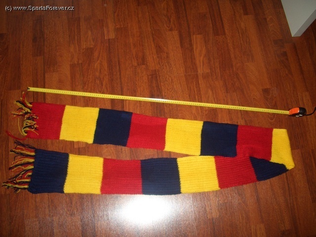 Vážení návštěvníci webu. Na trhu se sparťanskými suvenýry můžete sehnat mnoho druhů různých šál, barevných, méně barevných, hřejivých, malých, velkých, ošklivých a krásných. Jedna klasická šála na trhu však chyběla a tak se redakce Sparta Forever tuto mezeru nyní rozhodla zaplnit. Přicházíme s nabídkou exkluzivní ručně pletené pruhované šály, takzvané "old school", protože je opravdu taková jako by ji pletla před 30 lety Vaše babička, manželka nebo přítelkyně...ne všechny tyto milé osoby jsou však v současné hektické době ochotny pro každého z nás takovou krásu uplést, příp. neobětují tolik času a tak si musíme kupovat strojově pletené šály. Šála je 2,75 metru dlouhá a 25 cm široká. Tímto bezmála třímetrovým miláčkem se tak můžete nyní zahřát i Vy společně s několika sparťankami najednou nebo na ní můžete oběsit najednou hned několik fanoušků konkurenčního klubu (pozn. redakce: tento vtip není rozhodně naváděním k podobným nezákonným nekalostem!:).