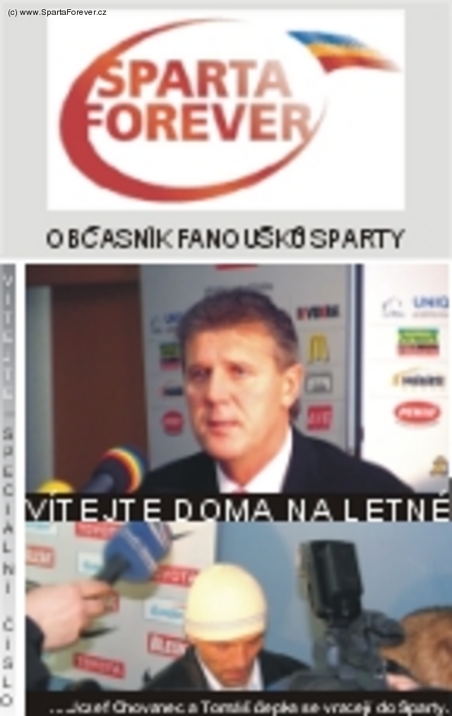 Jistě se všichni už těšíte na zápas s Libercem. Bude to velmi důležité utkání a doufáme všichni, že ani my fanoušci se nenecháme zahanbit a přijdeme v hojném počtu podpořit hráče, kteří to potřebují!! Sparta Forever má pro Vás hned 2 překvapení k příležitosti nadcházejícího zápasu. Tím prvním je vydání speciálního čísla občasníku Sparta Forever, který se týká návratu dvou Sparťanů Chovance a Řepky na Letnou a dále jsme se rozhodli rozšířit možnost jak prostřednictvím nás můžete přispět na choreo sparťanských fanoušků. Ano, jsou tady nálepky Sparta Forever, které bude možno dostat už na zápase s Libercem. Více informací v článku. Vychází už třetí speciální číslo občasníku, které bude v hojném počtu ZDARMA rozdáváno na zápase s Libercem. Dozvíte se v něm něco o Jozefovi Chovancovi a Tomášovi Řepkovi a také si budete moci přečíst referátek mistra Bombita, dále nechybí informace o 4. regulérním čísle občasníku Sparta Forever.