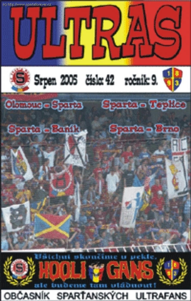 Jednou z možností jak přispět na choreo a tím i ke zlepšení atmosféry na stadionu na Letné je nákup zinu sparťanských ultras se stejnojmenným názvem. Už 42. číslo v 9. ročníku jeho existence bude k dostání od přípravného zápasu s Norimberkem na stadionu na Letné a to 30.7.2005 od 18:30 hodin. Doufejme, že se dostavíte v hojném počtu a v generálce na ligový start o týden později v Plzni podpoříte Spartičku nejvíce co to jde. Podpořit ji můžete svou účastí na utkání, svými hlasivkami a v neposlední řadě přispěním na své choreografie, choreografie sparťanských fanoušků! Více informací o zinu v článku.