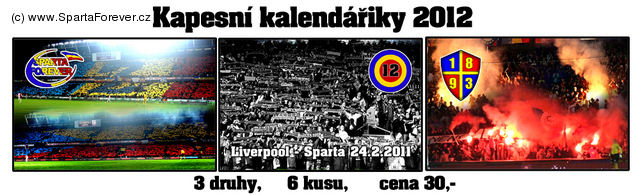 Na základě vašich žádostí jsme připravili i černou verzi mikiny Sparta Forever, tedy mikiny bez kapuce, která se nyní v zimním období pod bundu zvláště hodí, s vyšitým znakem Sparta Forever na prsou a potiskem SPARTA FOREVER na pravém rukávu. K dostání je prostřednictvím e-shopu zde: www.stylsport.cz/Zbozi.aspx?IDZbozi=580 nebo osobně v prodejně STYLSPORT na adrese Havanská 12, Praha 7. Cena je stejná jako u červené varianty 700,- Kč. Dále s dostatečným předstihem před začátkem nového roku přinášíme jako vždy kapesní kalendáříky, tentokráte na rok 2012 s českýmy nápisy vzadu (už žádná polština:) Balení po 6 kusech s 3 motivy - Sparta Forever, 12.HRÁČ a Ultras Sparta je možné získat také na e-shopu nebo osobně v prodejně STYLSPORT anebo také od našich pravidelných distributorů na zápasech Sparty. Cena je tradičních 30,- Kč a spolu s balíčkem získáte i kupon na slevu 10 % v obchodě STYLSPORT. Snad se vám novinky budou líbit a o dalších vás budeme průběžně informovat. Pokusíme se udělat vše po to aby to i v této oblasti na Spartě stále žilo.