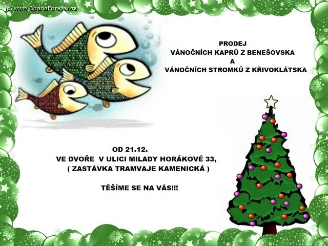 Už se stává pomalu tradicí prodej kapříků a vánočních stromečků pro Sparťany v ulici Milady Horákové u pražské Letné. Tudíž stejně jako při minulých akcích, tak i letos platí, že po předložení celoroční permanentky na zápasy fotbalového týmu AC SPARTA PRAHA na Letnou, získáte 10 % slevu právě na nákup kaprů a vánočních stromečků!
