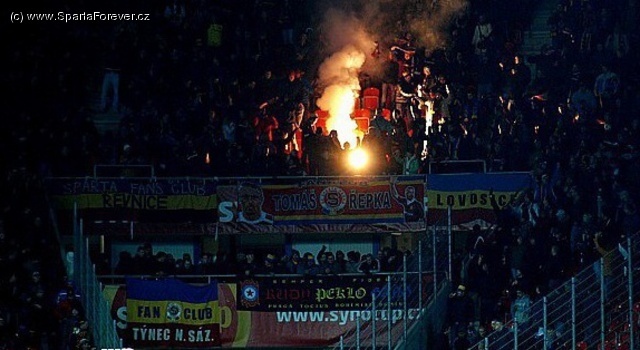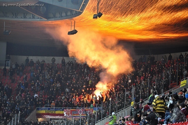 Na klidnou odvetu minerálky kapu se nedala čekat nějaká bůhvíjaká návštěva - jasný výsledek, hnusná zima a ještě několik dalších individuálních výmluv u jednotlivců - to vše dalo za výsledek necelých 7 stovek diváků. Na den narozenin naší milované Spartičky žalostné číslo. V kotli Sparty asi 40 lidi, z toho zhruba půlka se sem tam zahřála nějakým krátkým chorálem. Zazněl i dělený chorál Sparta - Praha,ale ten "překvapivě" vyzněl dosti úsměvně. Partička na protilehlé taky občas zafandila a zaskákala, ale jinak nic víc...