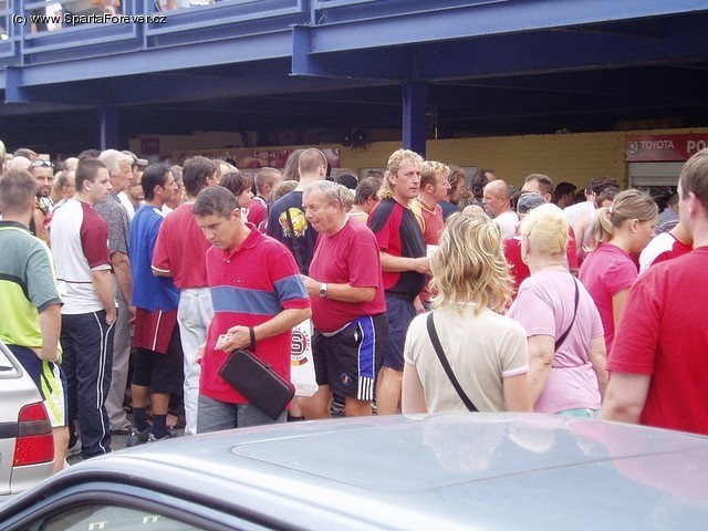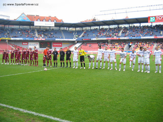 Jan Šimák obloučkem přehazuje řeckého obránce a uhýbá skokem jeho skluzu. Udělá krok, druhý, ale slunce pálí a míč je najednou tak daleko... Se skoro až slyšitelným povzdechem zvednou diváci ruce k potlesku pro obranný zákrok Ludovica Sylvestreho. Mezitím Petr Lukáš hraje malou domů a zatímco se Libor Došek objímá s obráncem, Petr Pižanowski sbírá dlouhý výkop. V Toyota Aréně dnes jako by nelidská vedra zpomalila čas. I míč snad pod žhnoucím žlutým kotoučem létal pomaleji. Poslední letní přípravný zápas Sparty za lidskou cenu dvaceti korun doprovodil program na tréninkovém hřišti, na tom hlavním si zahráli proti staré gardě mistrovští hokejisté, do hlediště putovaly zhruba dvě desítky podepsaných dresů (kupodivu ještě s logem Eurotelu). To všechno byla ale jen předehra. Teprve když vyběhlo na trávník jedenáct hráčů k rozcvičení, začalo to na Letné vřít.